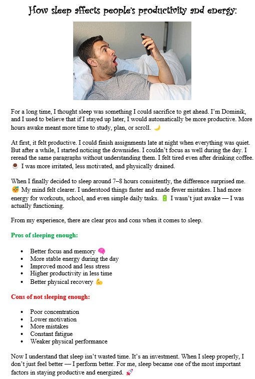 What I enjoy most about traveling is the chance to discover new places. I love walking through unfamiliar streets, visiting historical landmarks, and admiring beautiful landscapes. Sometimes I prefer relaxing trips, where I can spend time by the sea, enjoy the sunshine, and take a break from daily responsibilities. Other times, I look for more adventurous experiences, such as hiking in the mountains, exploring nature, or trying activities that I would not normally do at home.